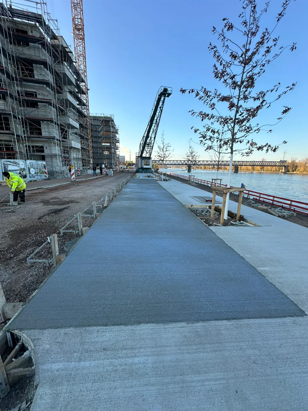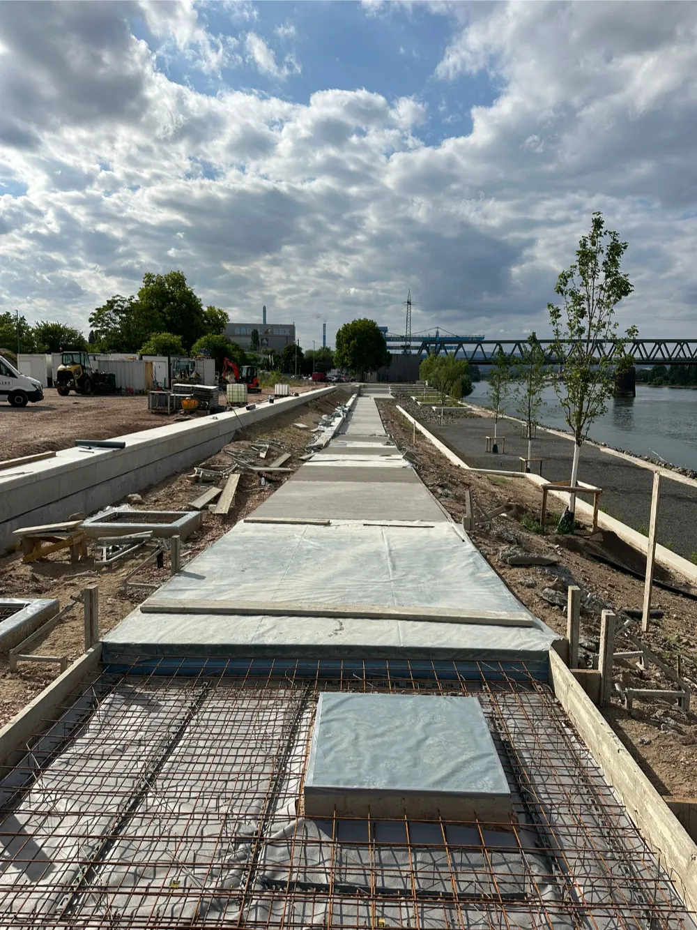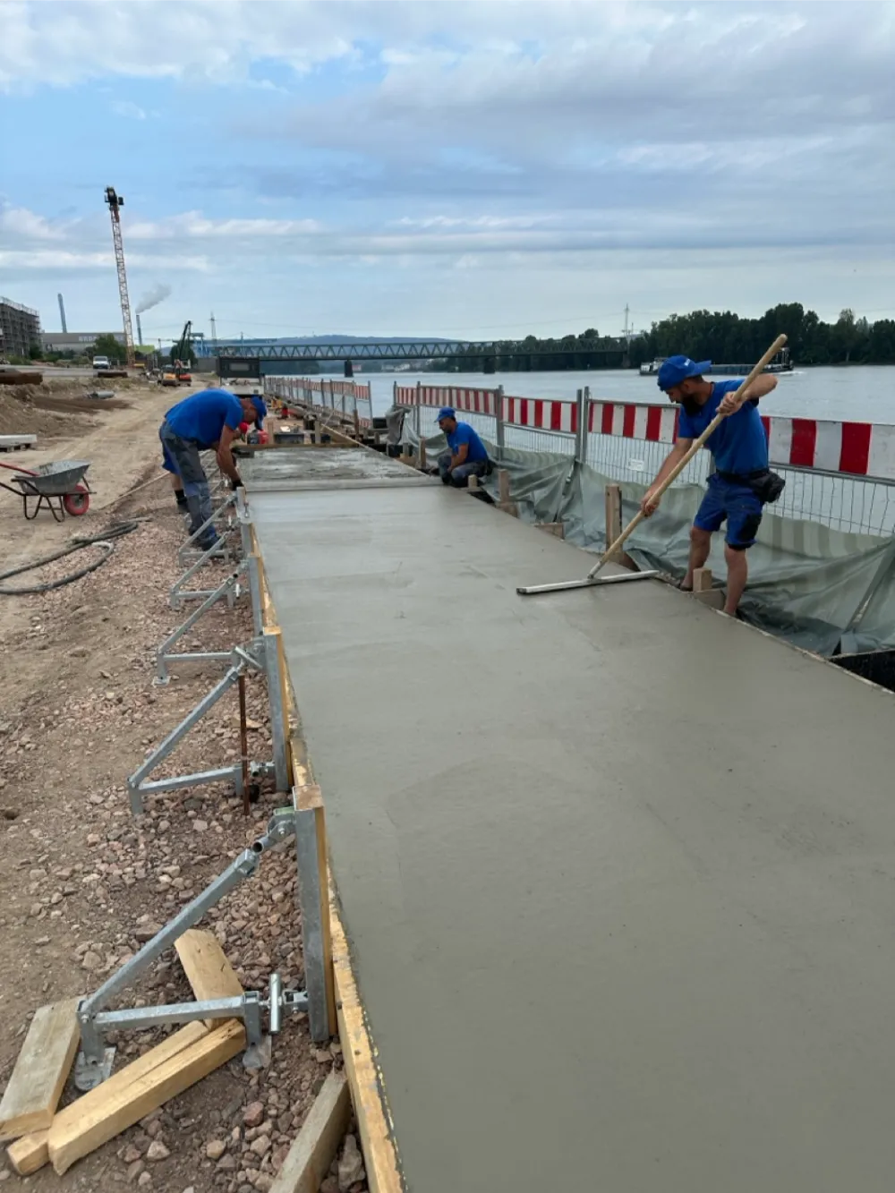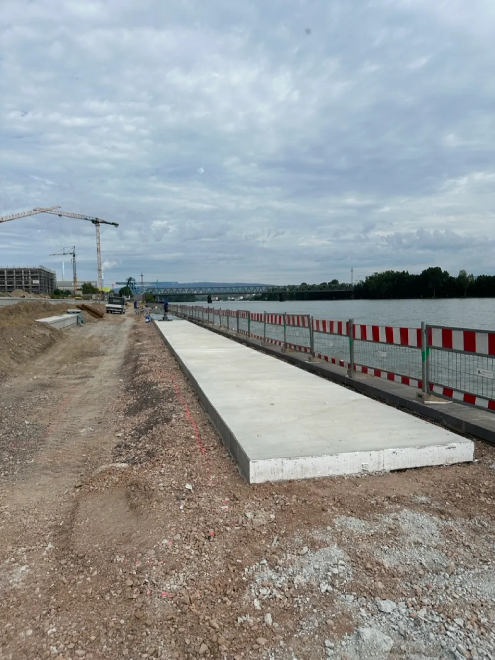 Herstellung neuer Betonwege im Bereich des Rheinufers am Zollhafen in Mainz.